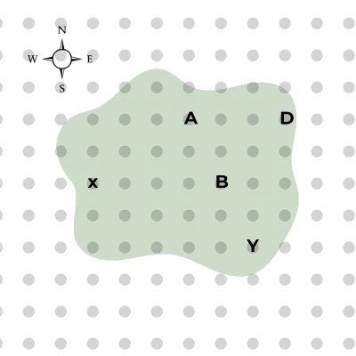 I start at X and travel 3 places east. Turn north and travel 2 spaces north. What letter am I on?